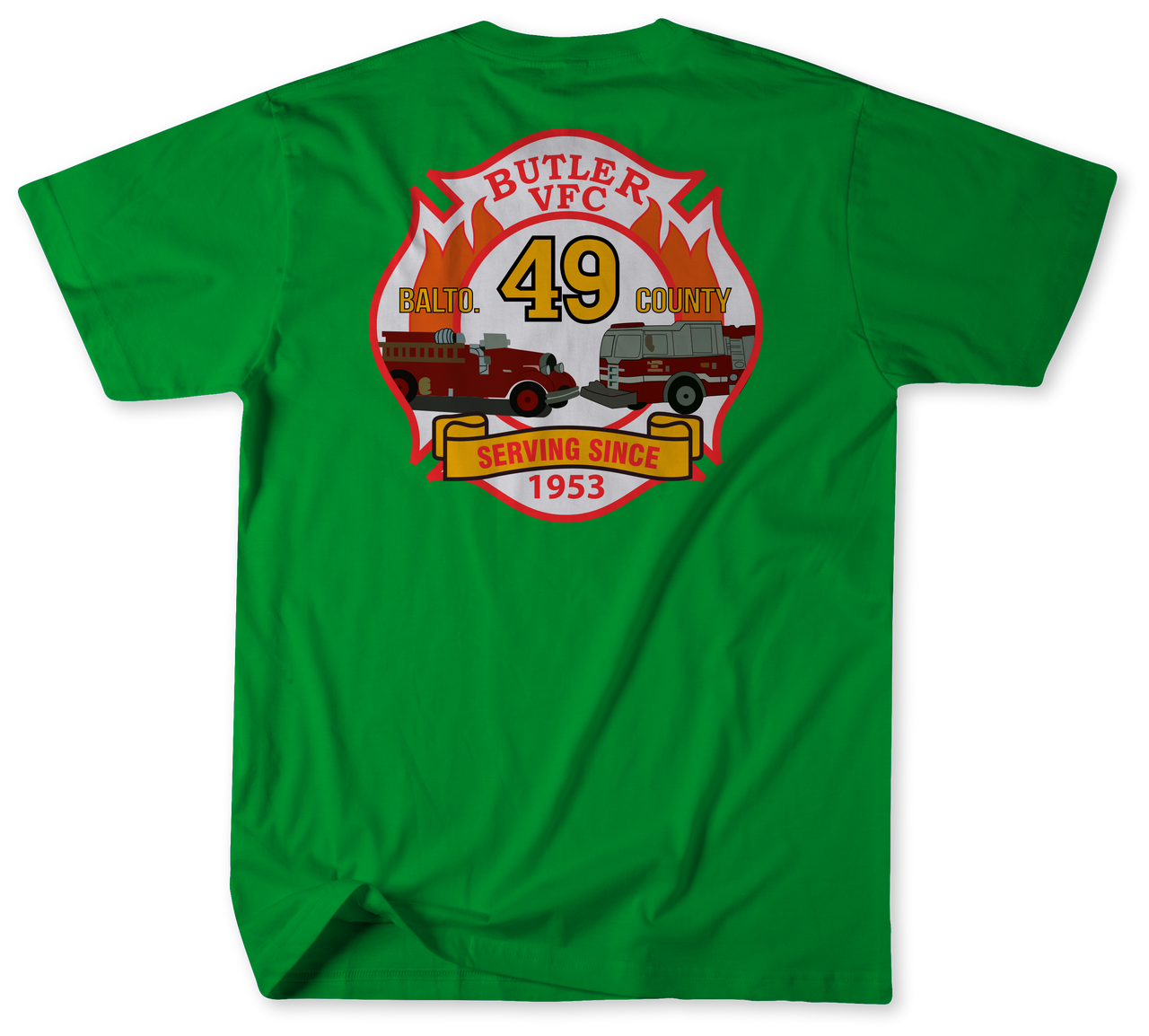 Loading... Please wait...Show your pride in Baltimore County’s volunteer fire service with the Unofficial Station 49 Shirt, honoring the members of the Butler Volunteer Fire Company. This shirt recognizes the firefighters and EMS personnel who protect the Butler community every day and the apparatus that answers the call, including Engine 491, Tanker 491, and Brush 492.