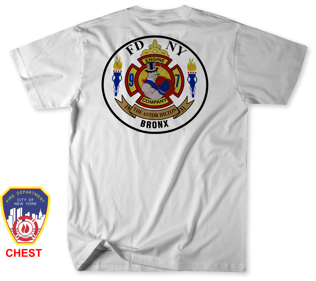 The front of the shirt features the classic FDNY department logo printed on the left chest, giving it a clean and recognizable fire service look. The design elements were carefully recreated to closely represent the spirit of Engine 97 / Thawing 97. While the logos may not be exact, every effort was made to capture the character and identity of this Bronx firehouse.