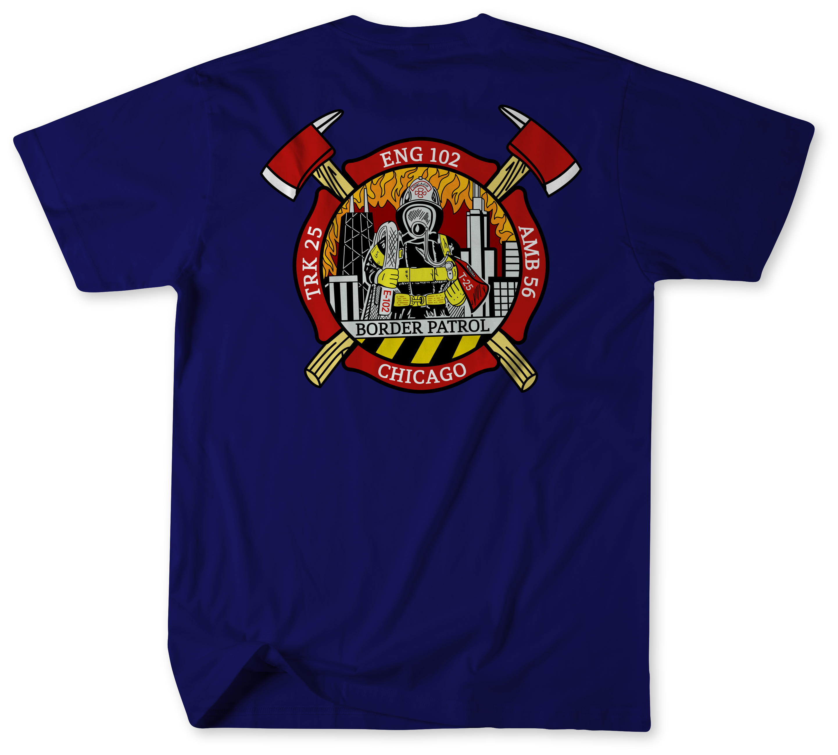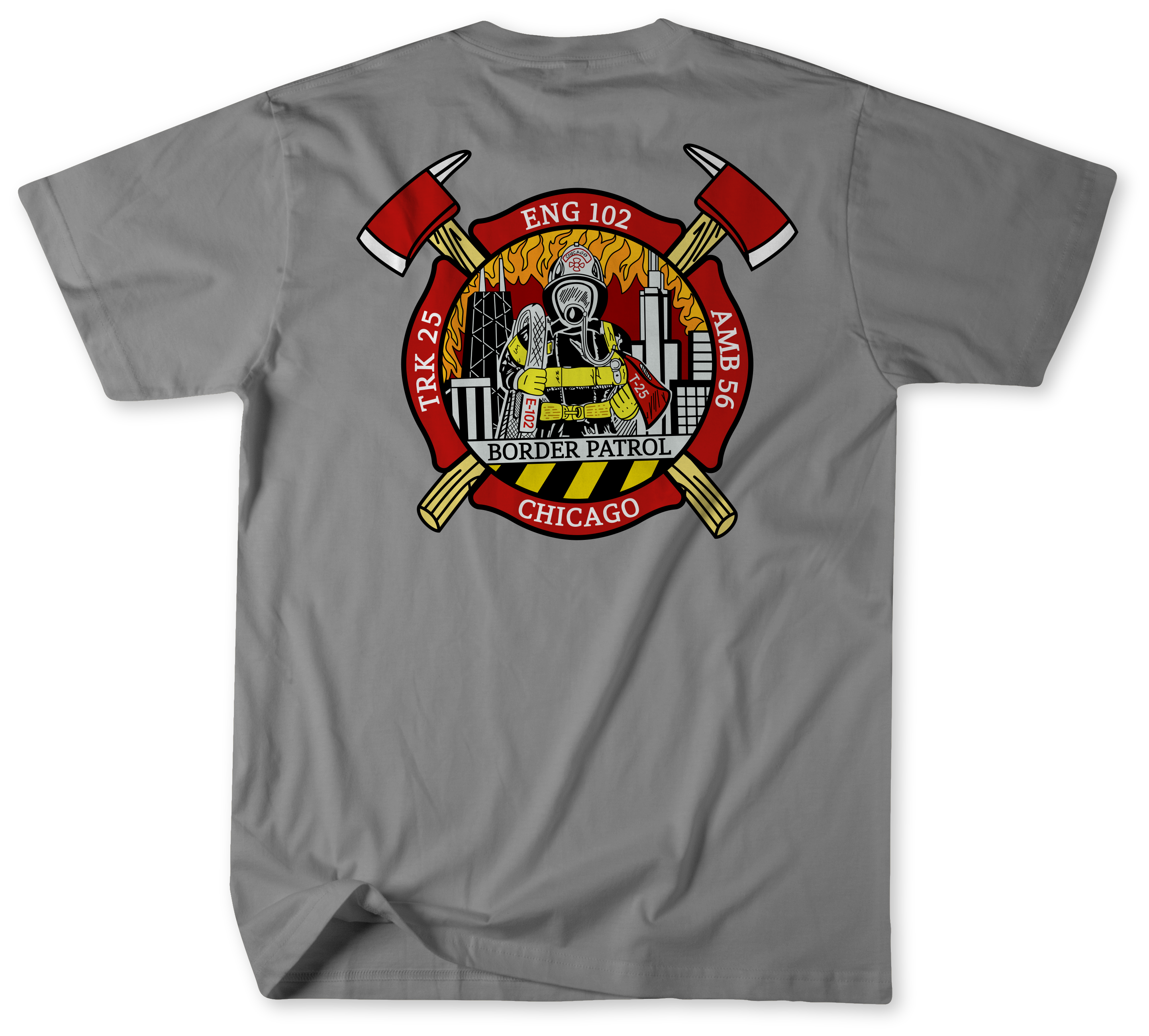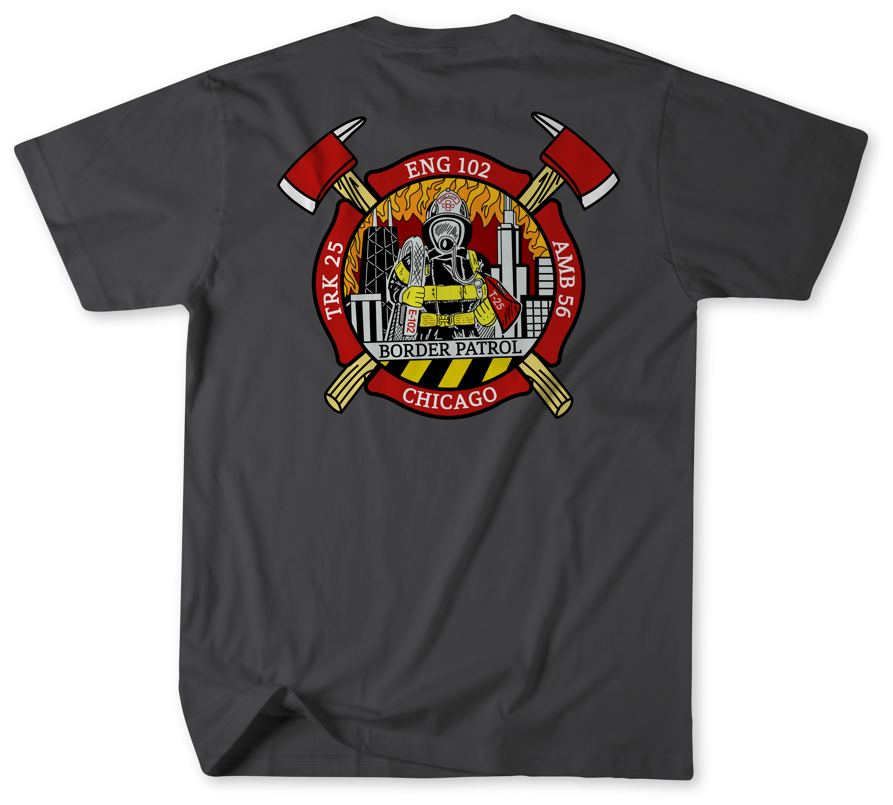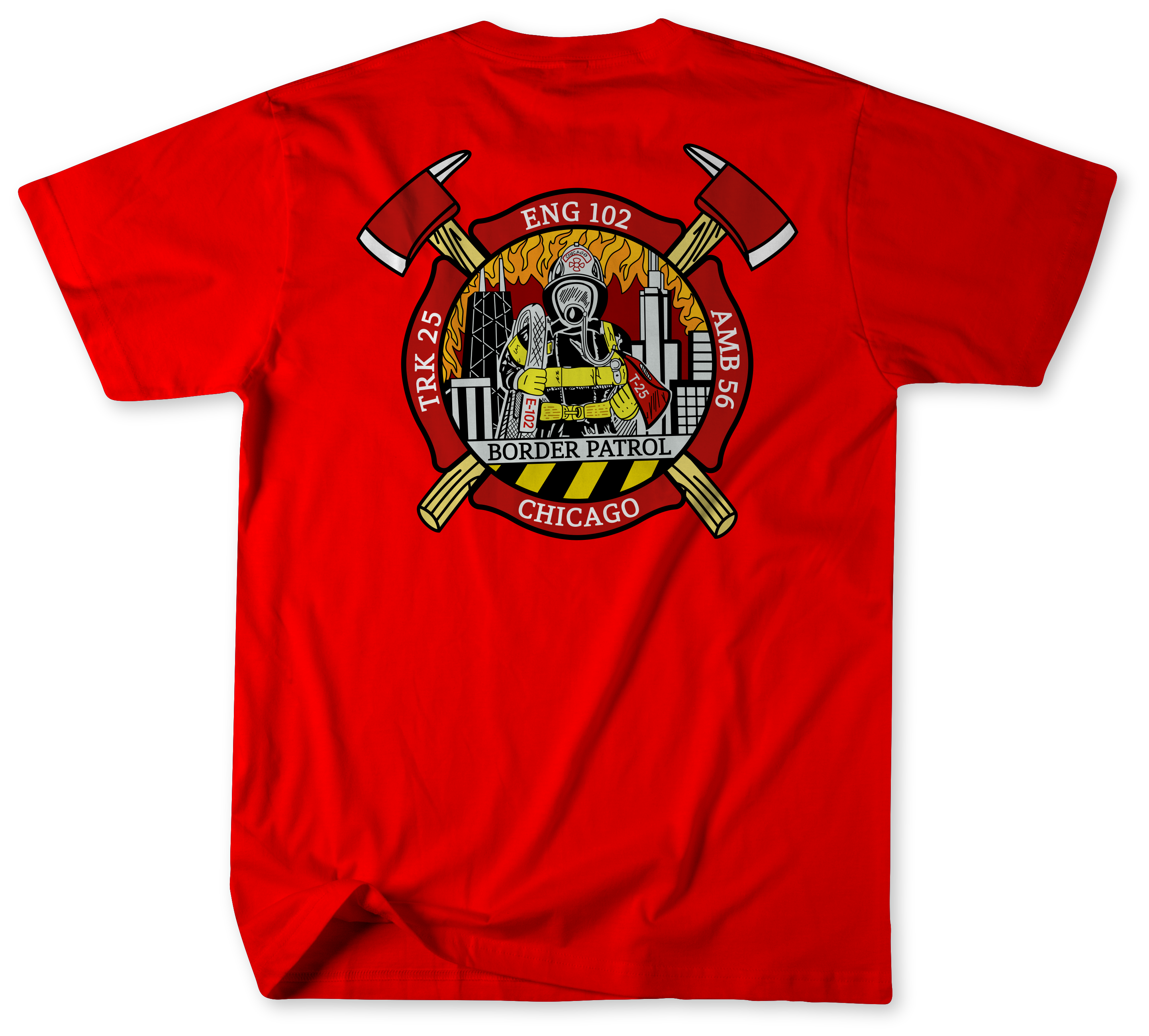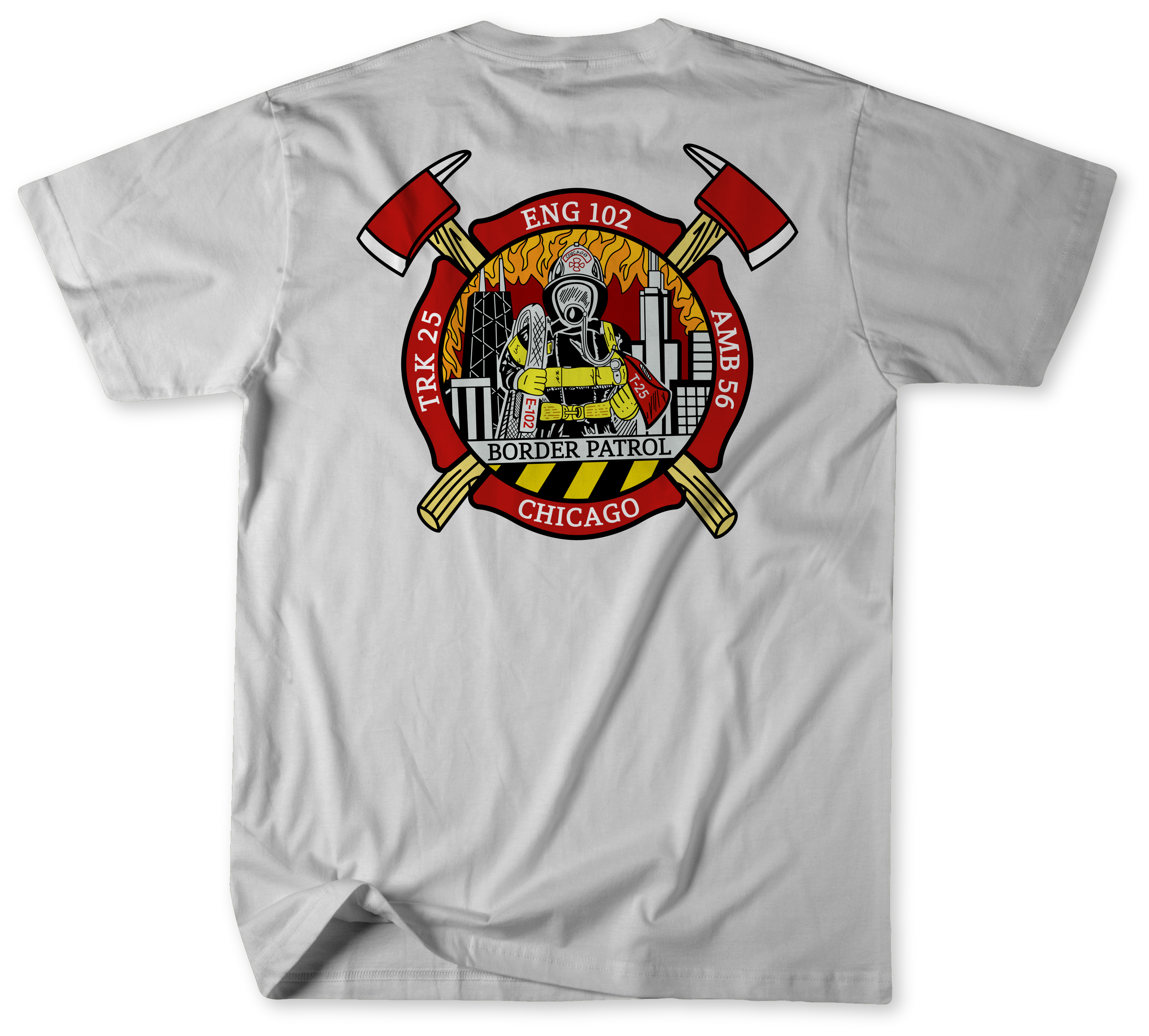 Calling all brave firefighters! Show your allegiance and pride for Firehouse 102 with our unforgettable Chicago Fire Department Firehouse 102 Shirt. Boasting their first due territory, it's your perfect way to let everyone know you stand firm behind Engine 102, Truck 25 and Ambo 56. Designed with firefighters in mind, this shirt is made of Gildan Ring spun Cotton for optimal comfort no matter the mission ahead. You'll be able to tackle any blaze or rescue with panache and remain in uniform while understanding your fine style choices don't go unnoticed. Trust us- this firefighter favorite will make an impression both on and off the job. Wear it day after day with confidence; from shift changeover to community visits, you'll always have the right look that doesn't sacrifice quality or comfort. This Chicago Fire Department Fire House t-shirt is an absolute essential for any true firefighter- so show what you stand for by wearing this must-have fashion statement today!