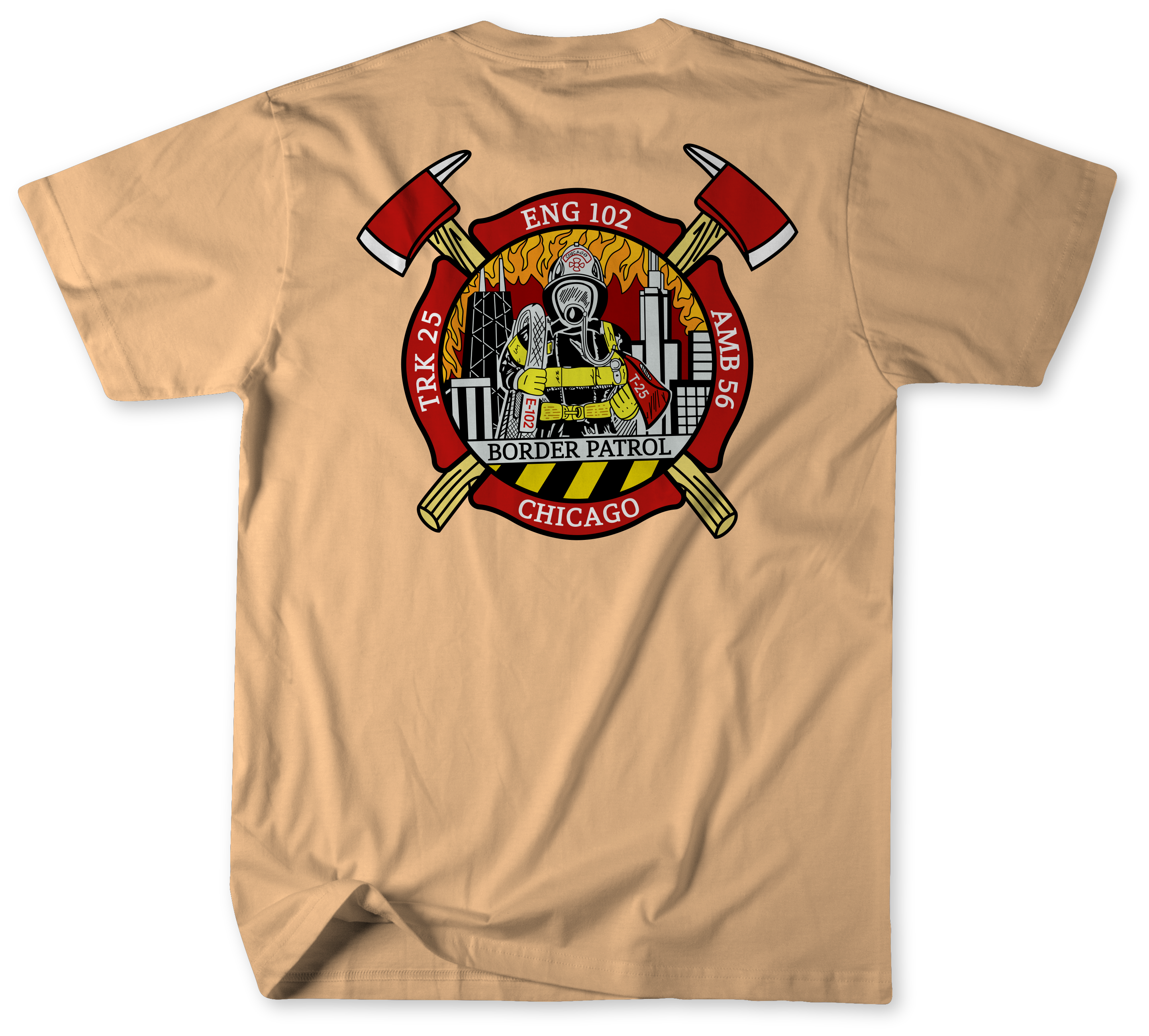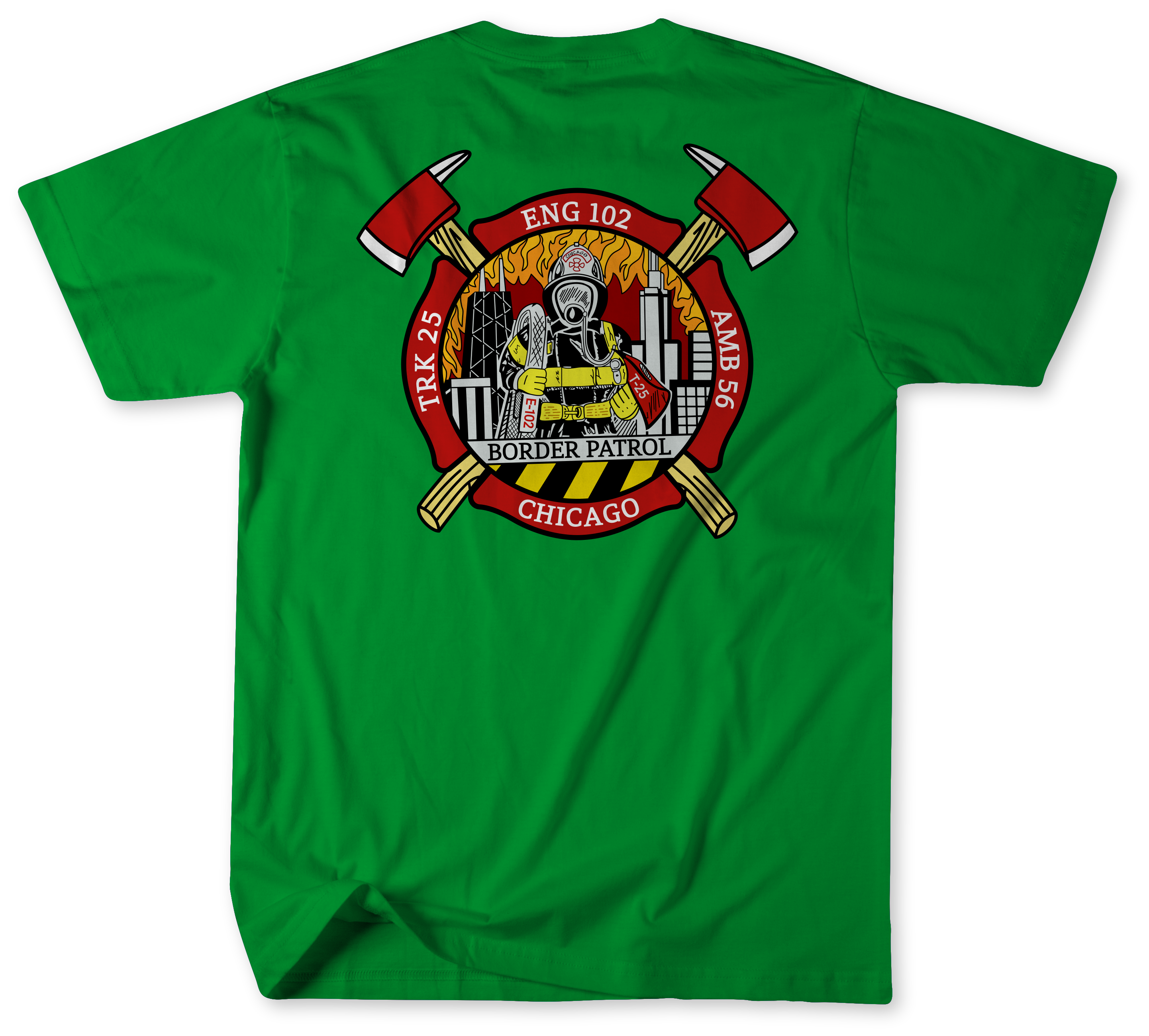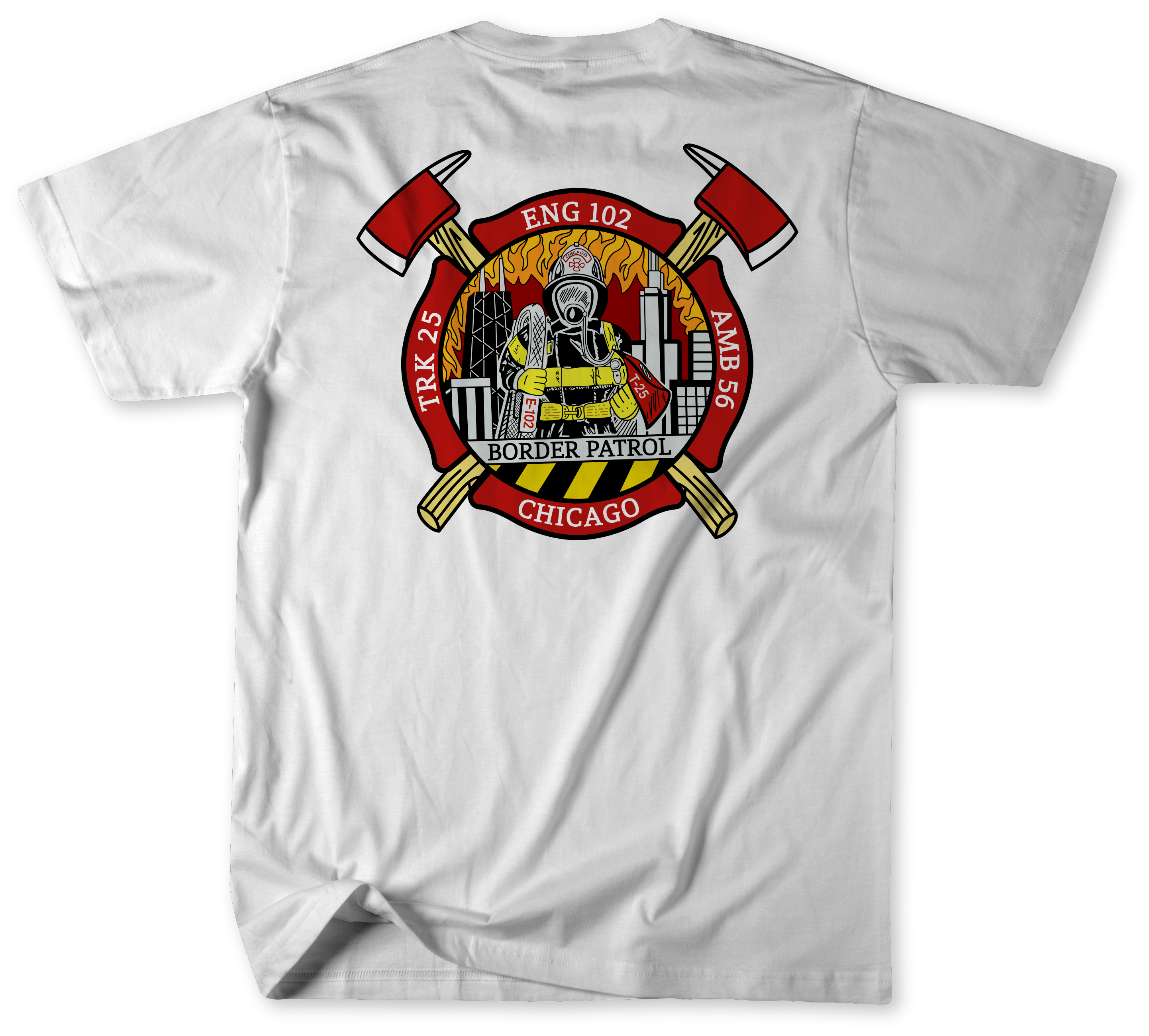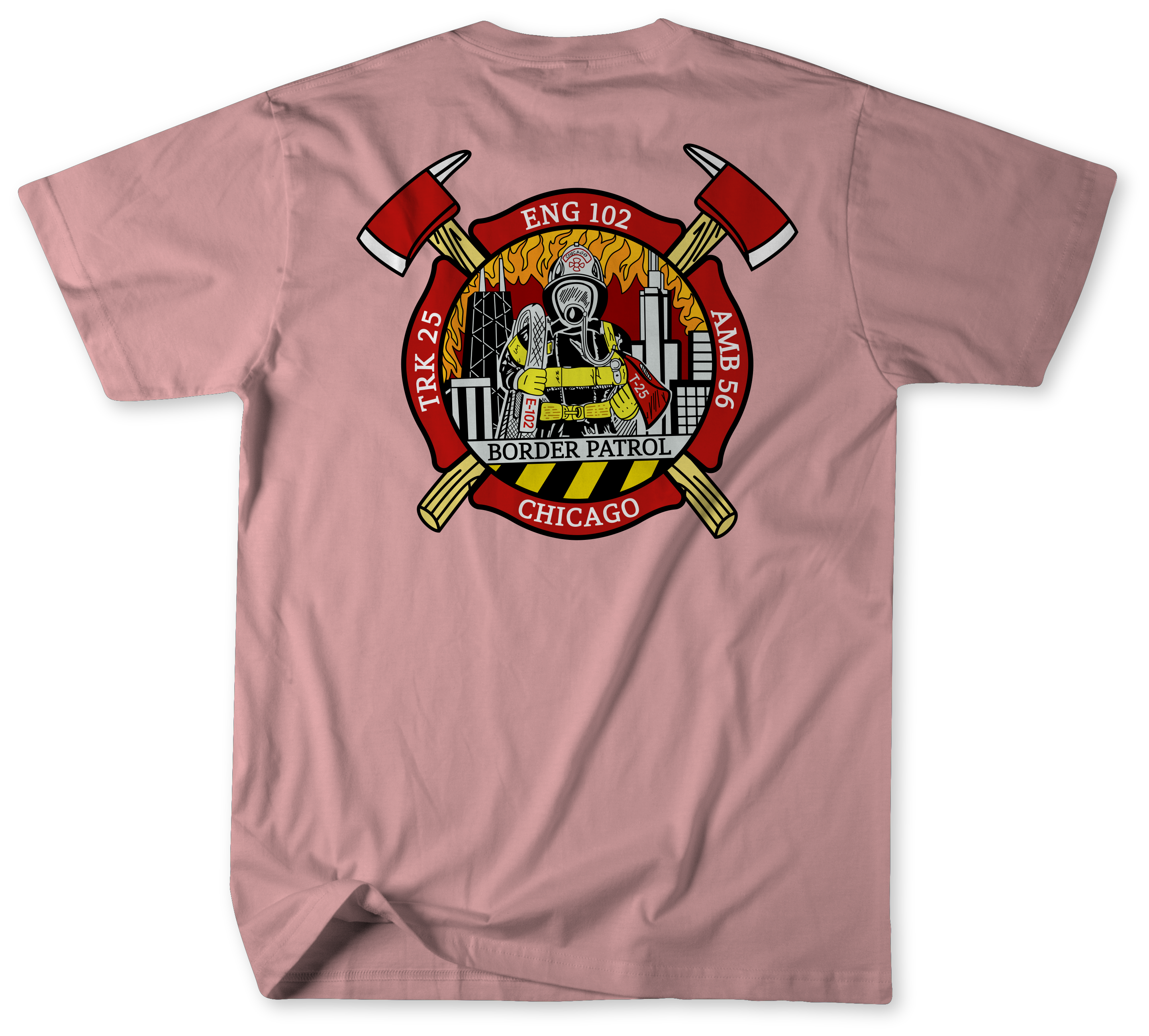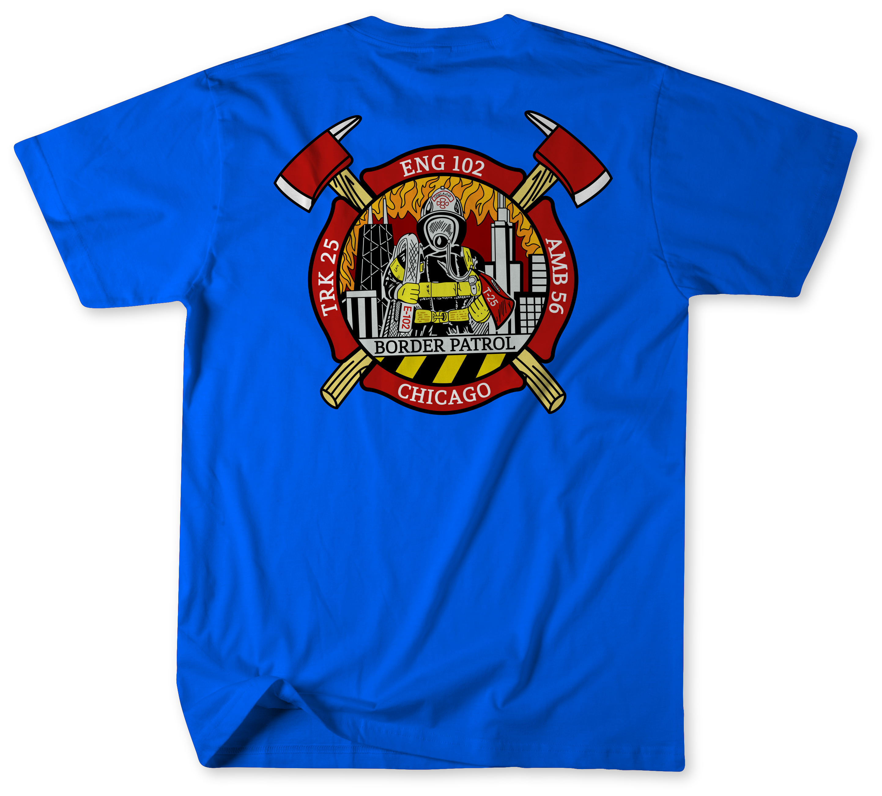 Calling all brave firefighters! Show your allegiance and pride for Firehouse 102 with our unforgettable Chicago Fire Department Firehouse 102 Shirt. Boasting their first due territory, it's your perfect way to let everyone know you stand firm behind Engine 102, Truck 25 and Ambo 56. Designed with firefighters in mind, this shirt is made of Gildan Ring spun Cotton for optimal comfort no matter the mission ahead. You'll be able to tackle any blaze or rescue with panache and remain in uniform while understanding your fine style choices don't go unnoticed. Trust us- this firefighter favorite will make an impression both on and off the job. Wear it day after day with confidence; from shift changeover to community visits, you'll always have the right look that doesn't sacrifice quality or comfort. This Chicago Fire Department Fire House t-shirt is an absolute essential for any true firefighter- so show what you stand for by wearing this must-have fashion statement today!