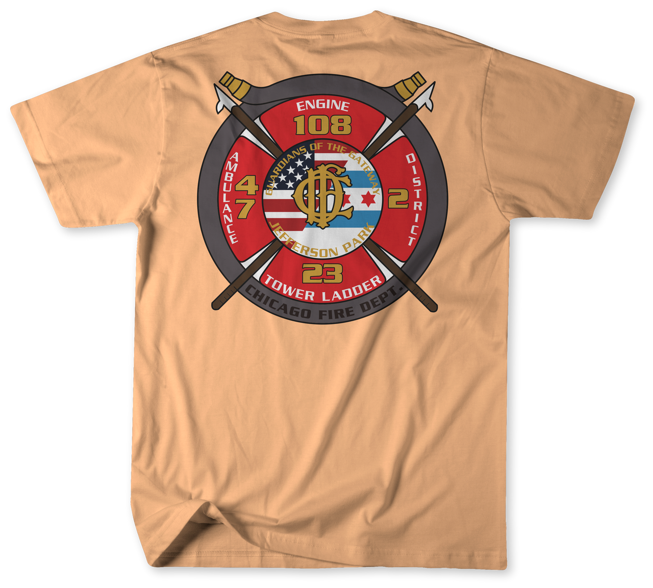 Make a statement with the Chicago Fire Department Firehouse 108 Shirt! This stylish tee is an easy way to show off your love and appreciation for Engine 108, Tower Ladder 23, and Ambo 47. Made from Gildan ring-spun cotton, it's sure to keep you feeling strong and comfortable all day. Show your support for the brave first responders of Jefferson Park by rocking this unique shirt. Whether you are a former member, current member, or just an admirer of Chicago's finest firefighters; this is the perfect piece for recognizing the hard work of these brave men and women. So grab yourself one today and let everyone know that you will never forget those who risk their lives every day in service to their communities!