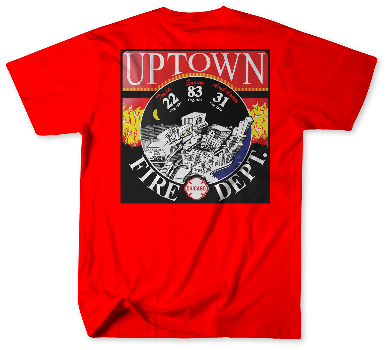 Get a piece of the life-saving action with Chicago Fire Department Fire House 83 T-shirts! These Gildan Ring spun Cotton Shirts are uniquely crafted for those who walk the line between heroism and bravery each day, and are designed to represent the heroic deeds of Engine 83, Truck 22, and Ambo 31 who carry out their duty with pride in Uptown. Show your commitment to the work they do by donning this incredible tribute - you'll be safe in the knowledge that your friends and family are protected by their courage! Plus, you'll look great doing it too. So join the Chicago Fire Department Fire House 83 with this one-of-a-kind T-shirt today!
