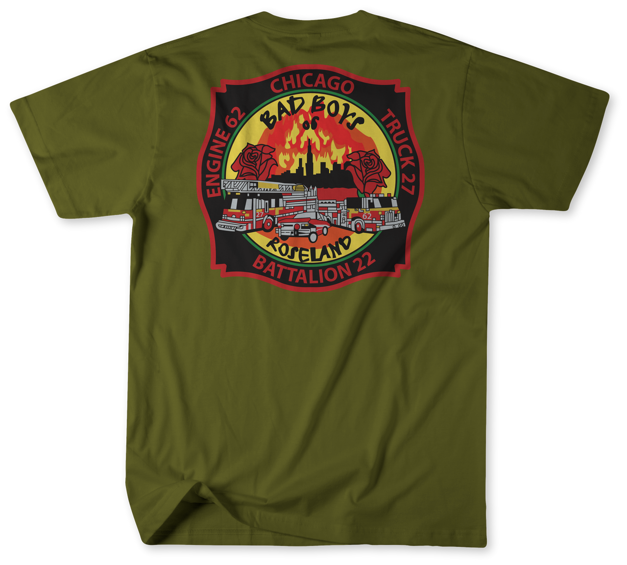 The newest addition to the Unofficial Chicago Fire Department Station 62 Apparel line is now available! Show your support for your local heroes with this shirt, made from high-quality Gildan Ring spun material. Proudly adorned with the emblem of Engine 62, Truck 27, and Battalion Chief 22 – the brave firefighters that protect the citizens of Roseland – you’ll be proud to stand shoulder-to-shoulder with your brothers and sisters in arms. Whether you’re a veteran and active-duty firefighter, or just an admirer of the unstoppable courage and strength of firefighters, show your support and become a part of the family of dedicated heroes that make Roseland safe. Get the Unofficial Chicago Fire Department Station 62 Shirt today and join the team!