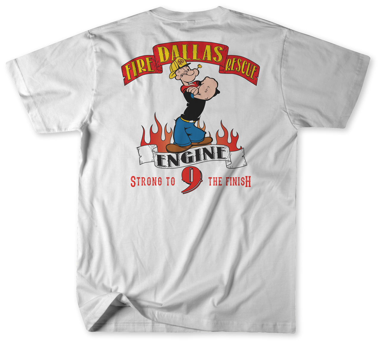 Take your Dallas pride to the next level with this standout Unofficial Dallas Fire Rescue Fire Station 9 Shirt! Show your support for the brave heroes at Fire Station 9 by displaying their famous motto, "Strong to the Finish". This humorous design features everyone's favorite sailor, Popeye, proudly wearing his uniform and carrying an axe. Made from the high-performance Gildan Ring Spun fabric, this shirt is perfect for grueling shifts and fighting fires. With 11 vibrant colors to choose from, you'll have no trouble showing your spirit! So make sure to grab your Unofficial Dallas Fire Rescue Fire Station 9 Shirt today and join the heroes at Fire Station 9 in showing their unwavering motivation and pride to fight through the challenging days.