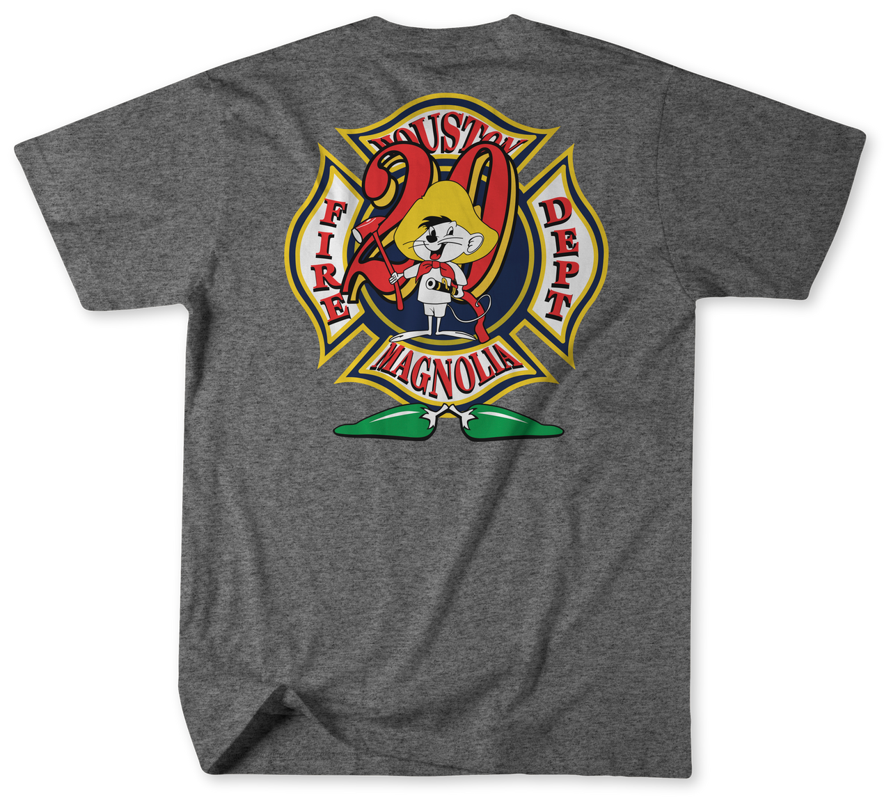 While the design on the shirt replicates a patch found, please be aware that it may not be the official logo of Houston Fire Station 20.
