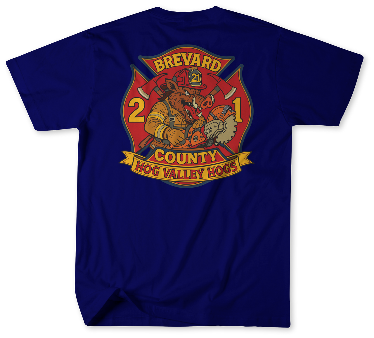 The shirt features distinctive graphics celebrating the Hog Valley Hogs. With a bold and eye-catching design, it showcases the pride and dedication of the heroes at Brevard County Fire Rescue Station 21.