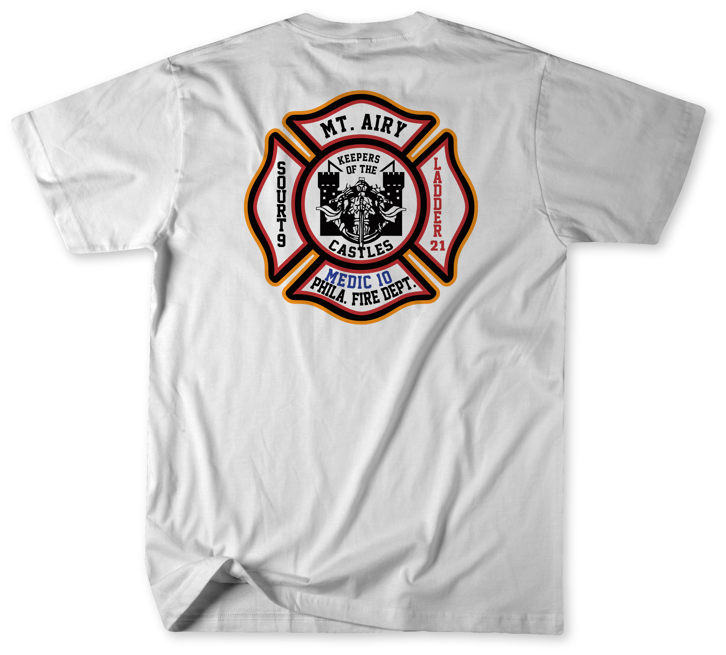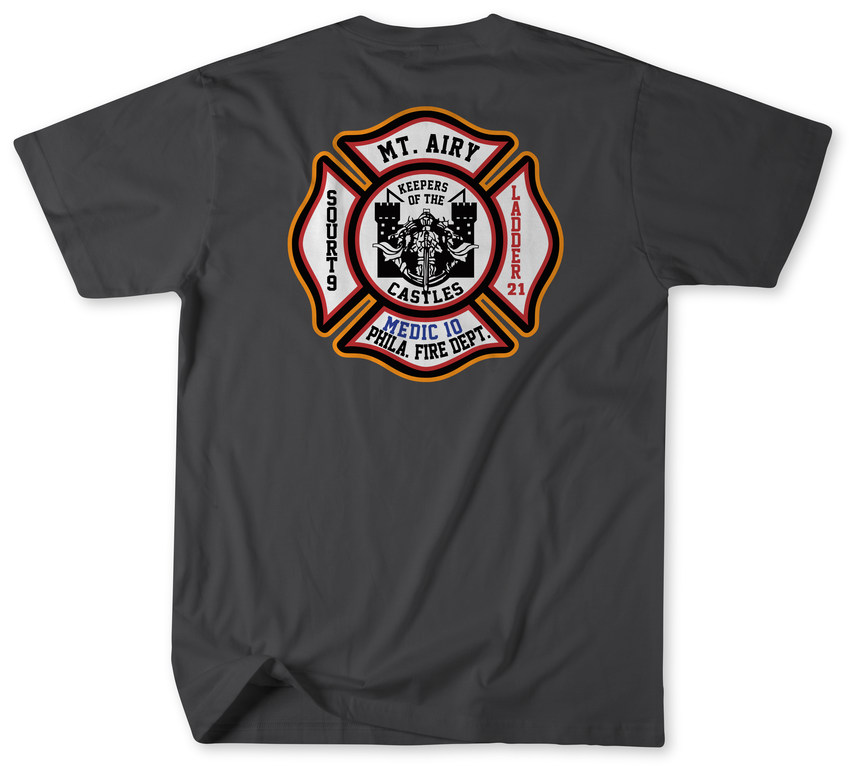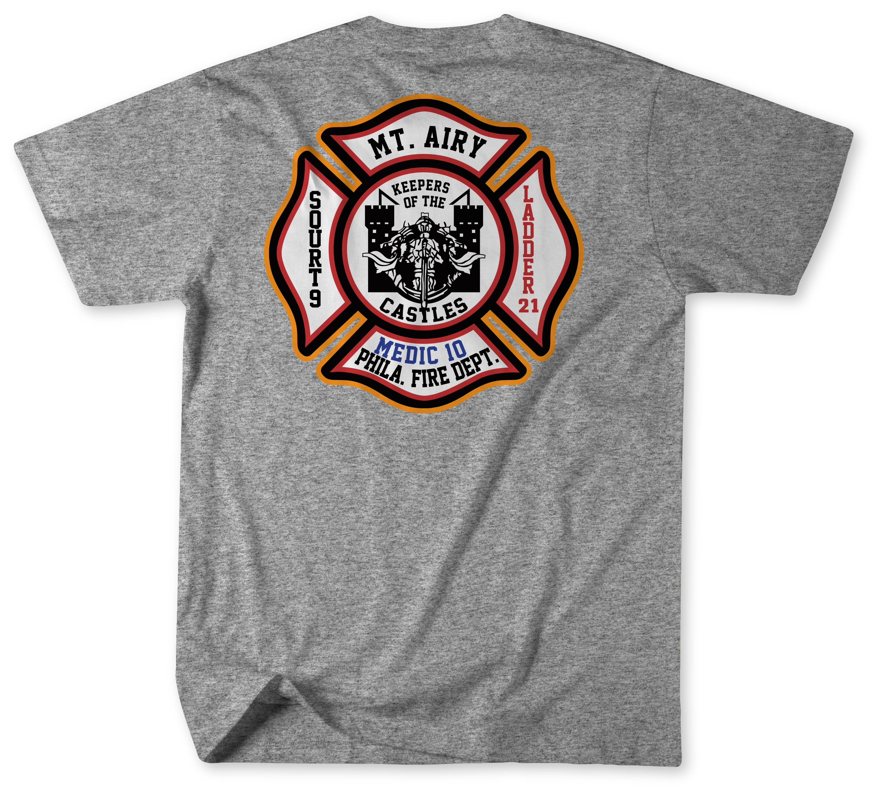 Show pride for the men and women of Squrt 9, Ladder 21, and Medic 10 with this Unofficial Philadelphia Fire Department Shirt. Representing the first due territory of Mount Airy, this shirt celebrates the dedication, tradition, and community service of the PFD companies that protect one of Philadelphia’s most historic neighborhoods.