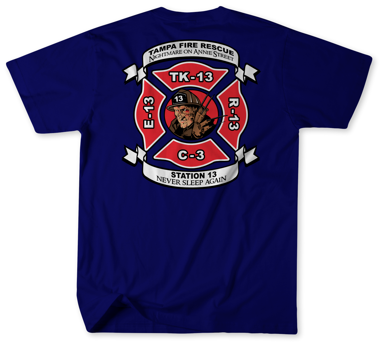 Attention, firefighters of Tampa Fire Rescue Station 13! Ready to show off your pride for the busiest station in the southeast? You don't want to miss out on the Tampa Fire Rescue Station 13 Shirt! We all know the slogan; "Nightmare on Annie Street, Never Sleep Again". This statement is true, and it deserves to be recognized! Grab the Tampa Fire Rescue Station 13 Shirt and let everyone know that you are proud to serve Engine 13, Engine 24, Rescue 13, Truck 13, and Chief 3. Each shirt is made from a Gildan Ringspun, so you know not only that you'll be reppin' your station, but that your gear will last. Get your Tampa Fire Rescue Station 13 Shirt today and go out in the world fearlessly - you've earned it!