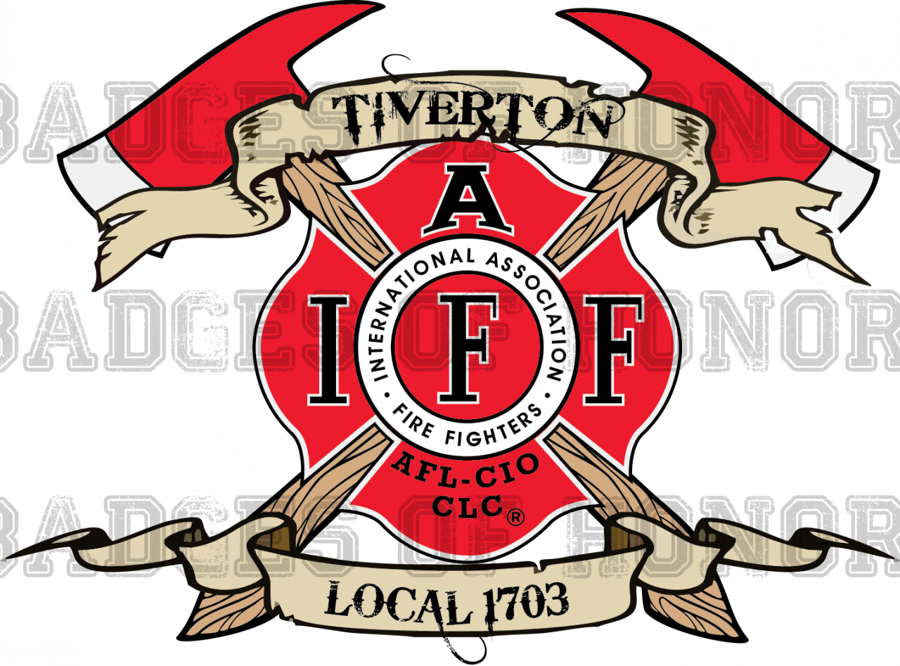 Tiverton Firefighters Local 1703 Short Sleeve shirt. Same image on front and back. Small on front left chest 4". Large on back 15"