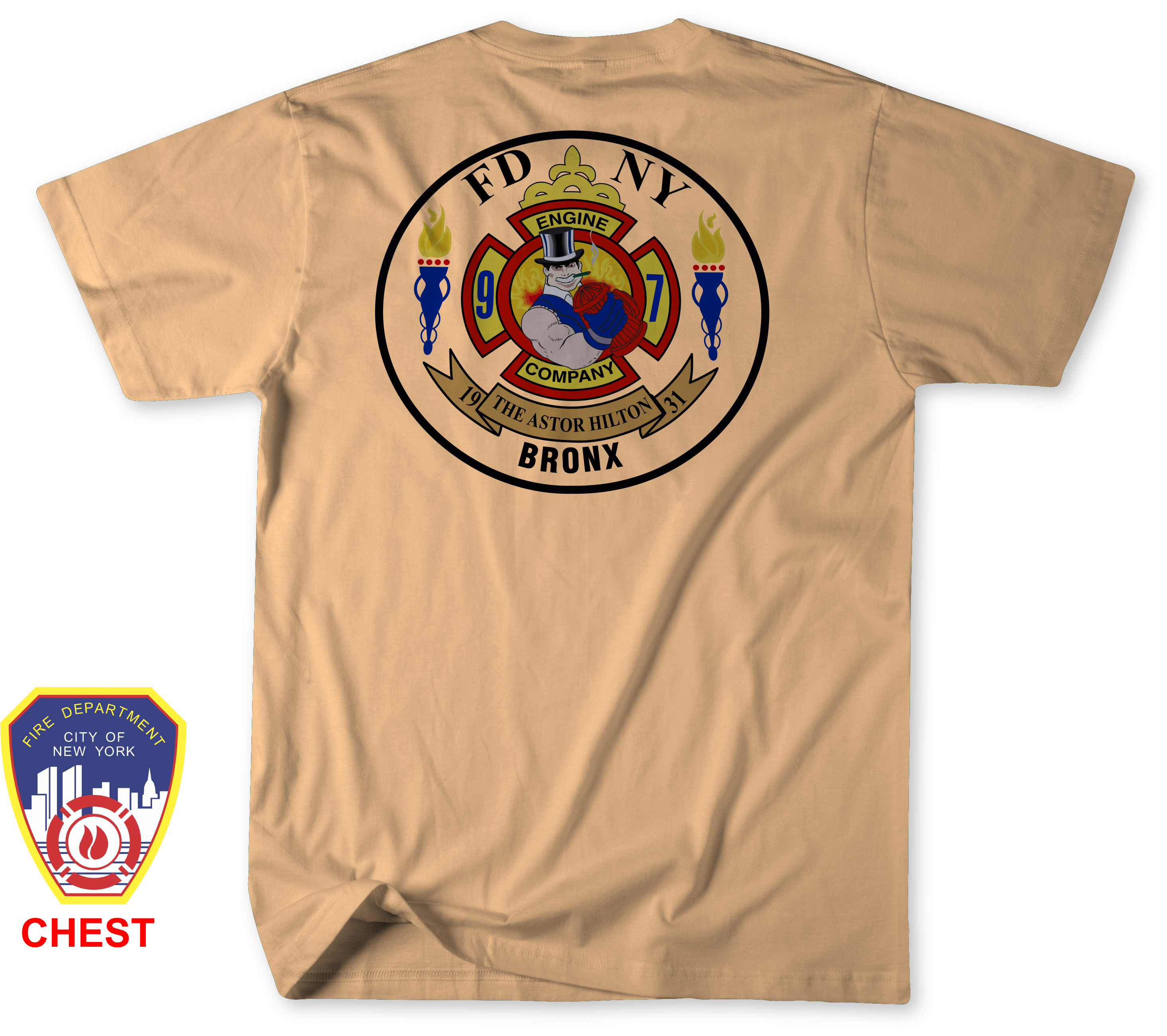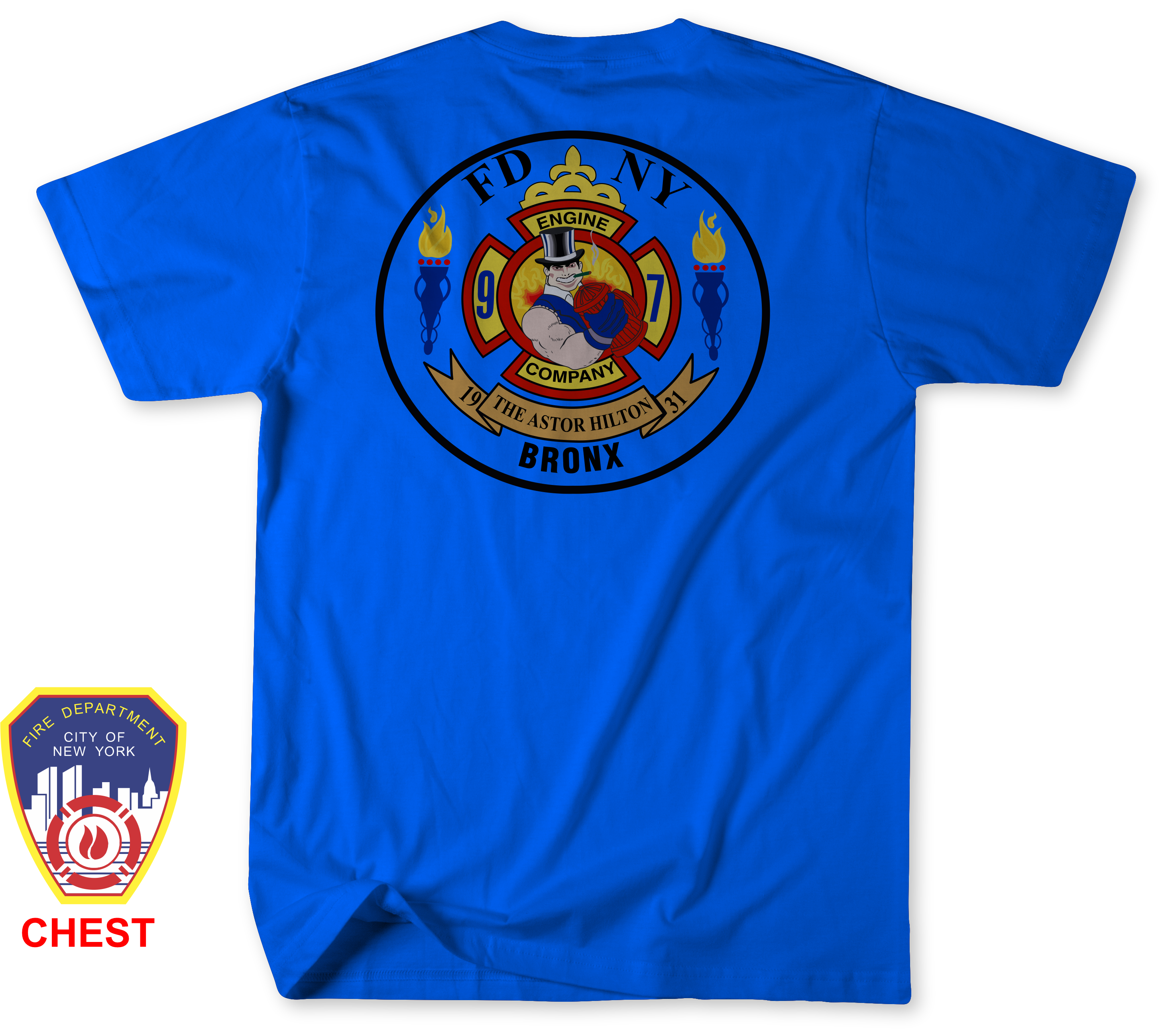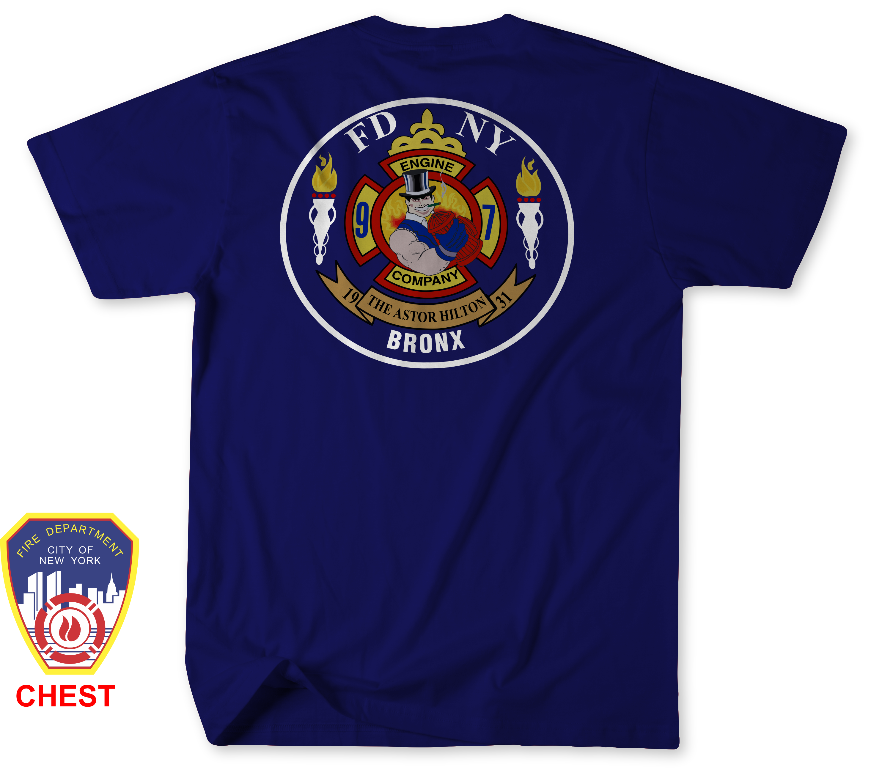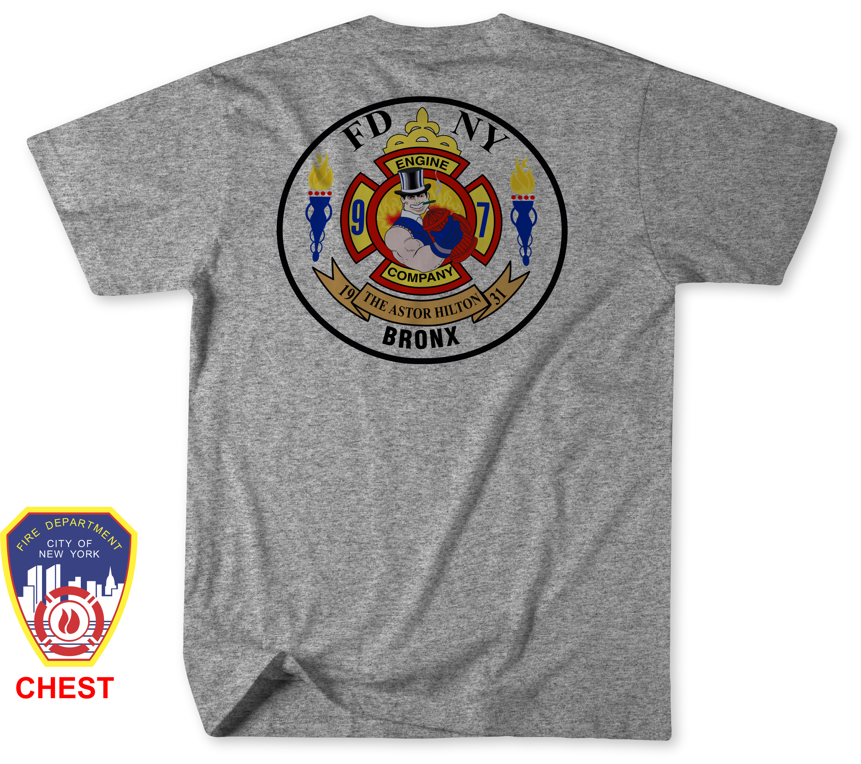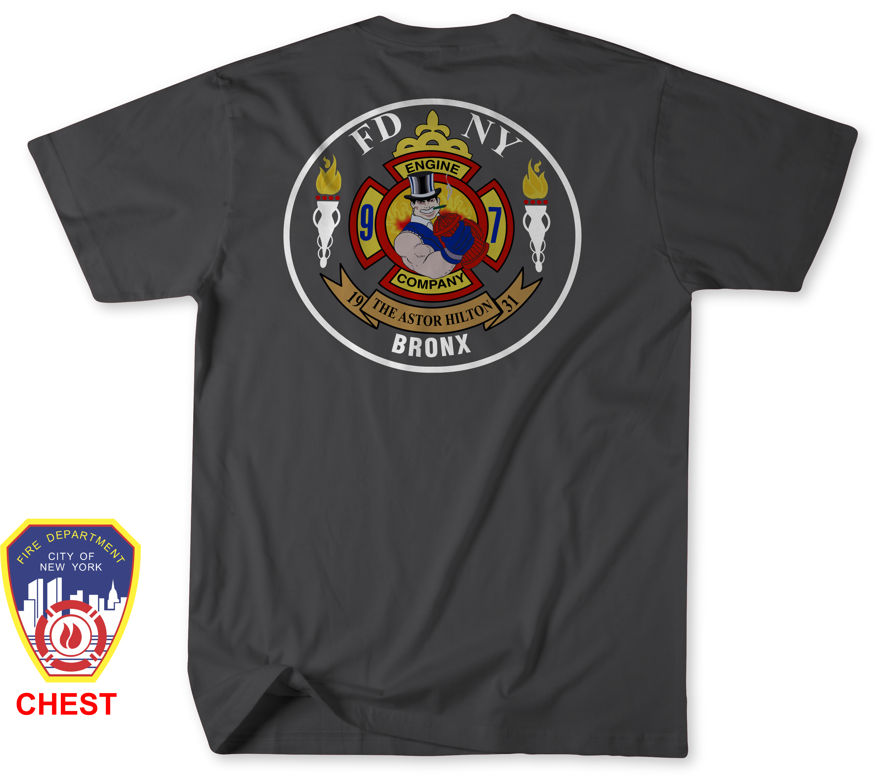 The front of the shirt features the classic FDNY department logo printed on the left chest, giving it a clean and recognizable fire service look. The design elements were carefully recreated to closely represent the spirit of Engine 97 / Thawing 97. While the logos may not be exact, every effort was made to capture the character and identity of this Bronx firehouse.